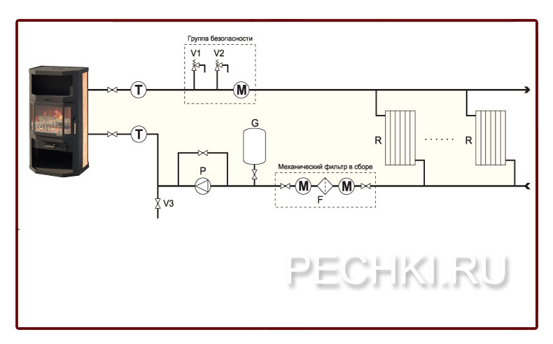 Аква может быть подкючена к открытой системе, в том числе без циркуляционного насоса, но в этом случае необходимо правильно построить систему отопления, соблюсти необходимые уклоны, сочетания диаметров труб, высоту системы и т.д. Монтаж такой системы обязательно должен производится квалифицированным специалистом. Также для самотечной системы необходимо производить плавный розжиг печи-камина.