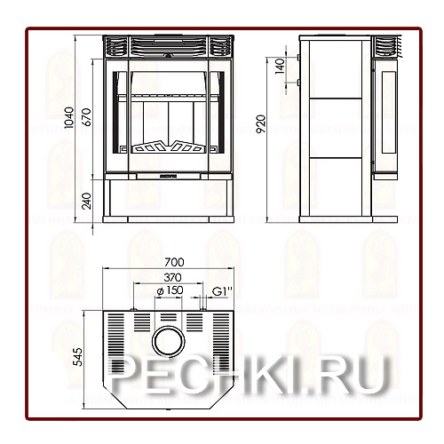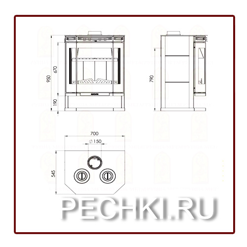 Диаметр дымохода - 150 мм Высота - 1010 мм Ширина - 560 мм Глубина - 510