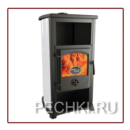 полена 40 см. Фронтальная загрузка дров. Диаметр дымохода 120 мм. Расположение дымохода сверху. Отделка белая. Этот отопительный агрегат - Печь CUCINA (КАСИНА), отличается не только эффектным внешним видом, но и многофункциональностью - в верхней части модели расположен духовой шкаф, позволяющий готовить пищу. Чугунные дверцы топки и духовки снабжены вставками из термостойкого стекла, позволяющими осуществлять визуальный контроль за происходящим внутри. Обе дверцы надежно фиксируются удобными оригинальными ручками. В нижней части топочной дверцы установлен регулятор, обеспечивающий контроль подачи воздуха в топку для обеспечения процесса горения, который также позволяет управлять работой печи и создавать различные режимы.