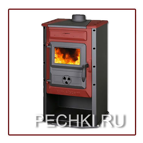 СТОВ) - это экономичное и экологичное решение отопления дома. Она предназначается для обогрева помещений площадью до 80 кв. м. Быстрому и эффективному распространению тепла способствует заложенный в конструкцию конвекционный принцип теплоотдачи. Корпус печи изготавливается из тонколистовой стали и покрыт термостойкой краской. Корпус несёт функцию каркаса и имеет малый вес. Топка выложена вермикулитовыми плитами способными выдерживать термические нагрузки до 1200°С. Является защитным материалом корпуса печи. Задняя стенка топки имеет специальные технические отверстия для подачи воздуха в камеру сгорания. Эта система обеспечивает вторичный дожиг уходящих газов, тем самым способствует увеличению КПД и длительности горения закладки дров, тем самым экономии топлива. Дверца топочной камеры изготовлена из серого чугуна и застеклена стеклокерамикой, способной выдерживать температуру до 750 С. В местах соприкосновения с корпусом и стеклом использован уплотнительный шнур. Дверца закрывается герметично, благодаря массивной ручке с прижимным замком. Над дверцей топки имеется регулировка подачи воздуха на стекло. Система позволяет стеклу оставаться чистым. Колосниковая решётка выполнена из чугуна и имеет подвижный механизм для стряхивания золы. Зольный ящик спрятан за чугунной дверцей с регулировкой подачи воздуха на колосник. Чистку от золы можно производить не прерывая горения. Подключение к дымоходу производится через чугунный патрубок, расположенный сверху.
