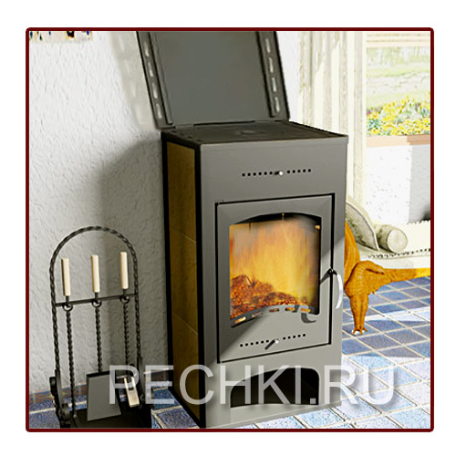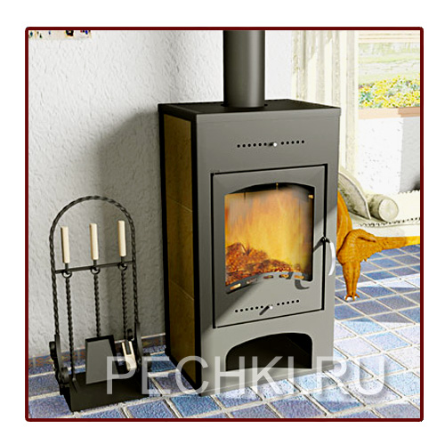 позволяет устанавливать печь в домах без сооружения дополнительного фундамента. Каминная дверца имеет достаточно крупную стеклянную вставку через которую удобно контролировать процесс горения топлива и любоваться красотой пламени. Открывается вбок, благодаря чему внутреннюю сторону стекла чистить просто и удобно. Также
