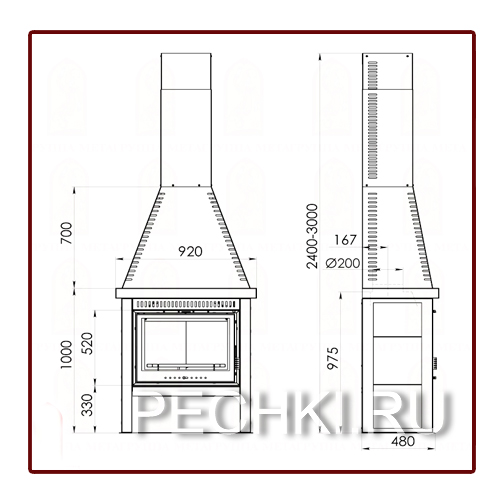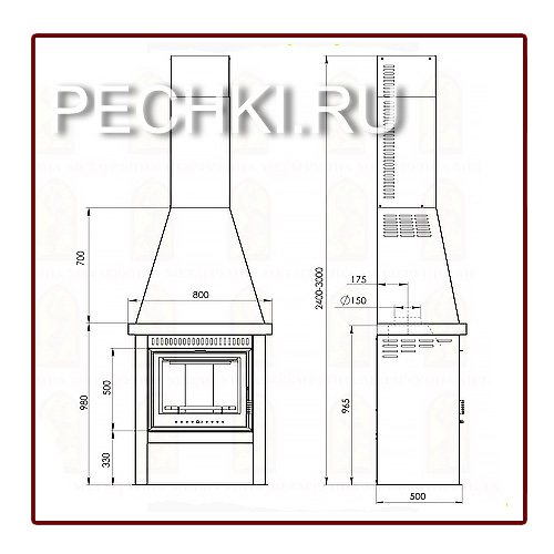 регулируется по высоте, максимальная высота печи 3000 мм. Модель подходит для помещений с высокими потолками или вторым светом.