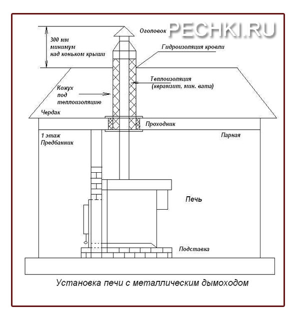 :: схема установки печи для бани БРЕНЕРАН с металлическим дымоходом