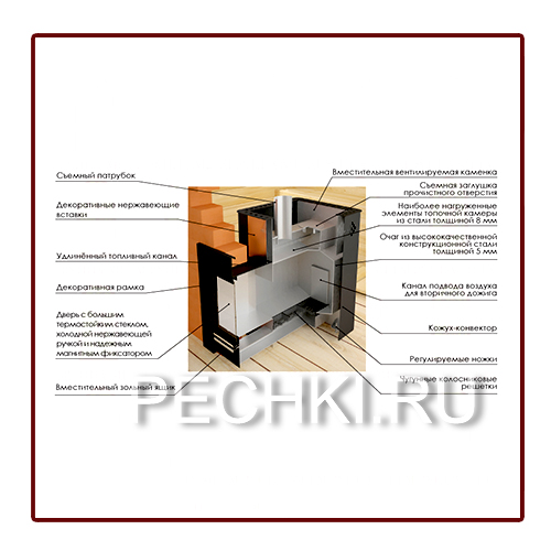 Вместительная вентилируемая каменка прогревается пламенем с нескольких сторон и эффективно нагревает камни. Камни нагреваются до 300 С уже через 1,5-2 часа. За это время парная не успевает перегреться, а раскаленные камни обеспечивают достаточно комфортный и мягкий пар. Кожух-конвектор создает мощный горячий конвекционный поток, равномерно прогревающий парилку, и экранирует жесткое инфракрасное излучение, исходящее от раскаленных стенок топки. В конструкции печи предусмотрен вторичный дожиг газов. Такое решение обеспечивает увеличение температуры сгорания газов, повышение КПД печи, уменьшение расхода дров и снижение вредных выбросов в атмосферу. Удобный зольник является регулятором интенсивности горения. Предусмотрена возможность изменения направления открывания дверки.