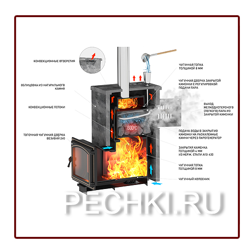 Это целый не только технический, но и функциональный комплект для полноценного разнообразия банных процедур! Чугунная печь для бани ЛЕГЕНДА РУССКИЙ ПАР 24 Next от ВЕЗУВИЙ облицована 4мм натуральным камнем и предназначена для получения мелкодисперсного – самого комфортного и полезного пара. Он не обжигает дыхательные пути, эффективно увлажняет кожу и благотворно влияет на состояние организма в целом, позволяет действительно насладиться баней. Такой пар обеспечивается, благодаря закрытой каменки в банной печи ЛЕГЕНДА РУССКИЙ ПАР 24. Каменка охвачена круговым потоком пламени и камни в ней прогреваются до температуры 600 °С, что позволяет создать в парилке наиболее благоприятный микроклимат, не пересушивая и не перегревая воздух. Вода подается в самую горячую центральную часть закрытой каменки через воронку, при этом дверь закрытой каменки должна быть приоткрыта для поступления мелкодисперсного пара в парное отделение.
