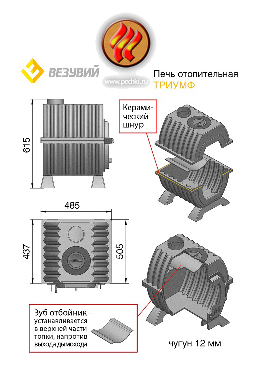 Преимуществом печи ТРИУМФ является то, что топка состоит из двух чугунных элементов, толщиной не менее 12 мм. На стыке между деталями используется керамический шнур с рабочей температурой 1200 градусов. Топка печи абсолютно герметична.