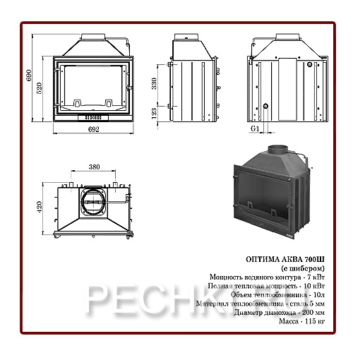 Технические характеристики: Мощность: 10 кВт Мощность контура: 7 кВт Объем теплообменника: 10 л Материал теплообменника: сталь 5 мм Ширина: 692 мм Высота общая: 690 мм Высота по фасаду: 520 мм Глубина: 420 мм Масса: 115 кг Диаметр дымохода: 200 мм Поднимающий дверцу механизм: нет Тип: закрытая комбинированная каминная топка с водяным контуром Производитель: EUROKAMIN, Франция-Россия